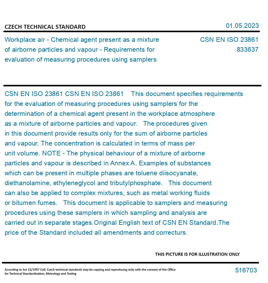 CSN EN ISO 23861 This document specifies requirements for the evaluation of measuring procedures using samplers for the determination of a chemical agent present in the workplace atmosphere as a mixture of airborne particles and vapour. The procedures given in this document provide results only for the sum of airborne particles and vapour. The concentration is calculated in terms of mass per unit volume. NOTE - The physical behaviour of a mixture of airborne particles and vapour is described in Annex A. Examples of substances which can be present in multiple phases are toluene diisocyanate, diethanolamine, ethyleneglycol and tributylphosphate. This document can also be applied to complex mixtures, such as metal working fluids or bitumen fumes. This document is applicable to samplers and measuring procedures using these samplers in which sampling and analysis are carried out in separate stages. Original English text of CSN EN Standard. The price of the Standard included all amendments and correcturs.