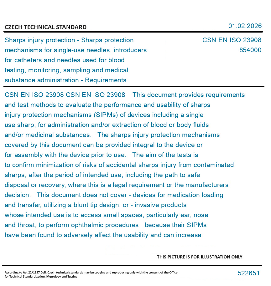 CSN EN ISO 23908 This document provides requirements and test methods to evaluate the performance and usability of sharps injury protection mechanisms (SIPMs) of devices including a single use sharp, for administration and/or extraction of blood or body fluids and/or medicinal substances. The sharps injury protection mechanisms covered by this document can be provided integral to the device or for assembly with the device prior to use. The aim of the tests is to confirm minimization of risks of accidental sharps injury from contaminated sharps, after the period of intended use, including the path to safe disposal or recovery, where this is a legal requirement or the manufacturers' decision. This document does not cover - devices for medication loading and transfer, utilizing a blunt tip design, or - invasive products whose intended use is to access small spaces, particularly ear, nose and throat, to perform ophthalmic procedures because their SIPMs have been found to adversely affect the usability and can increase the risk for patients versus the benefit of the intended use of the device. This document does not cover solid-core needles used for surgery (e.g. suture needles).