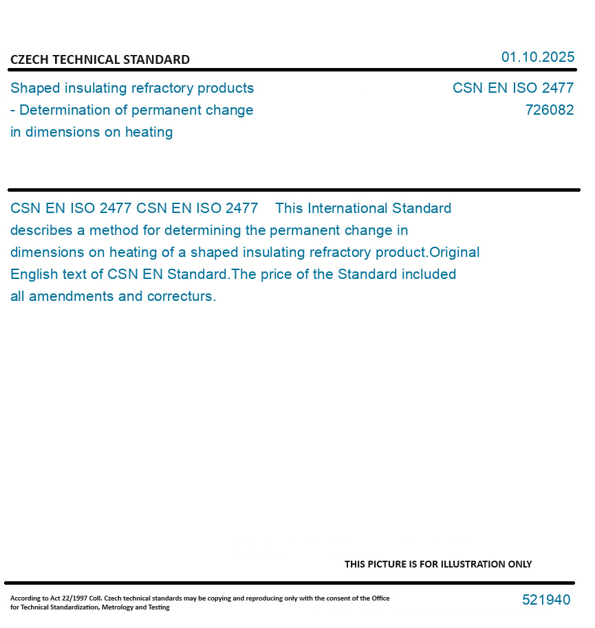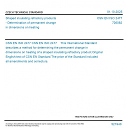 CSN EN ISO 2477 This International Standard describes a method for determining the permanent change in dimensions on heating of a shaped insulating refractory product. Original English text of CSN EN Standard. The price of the Standard included all amendments and correcturs.