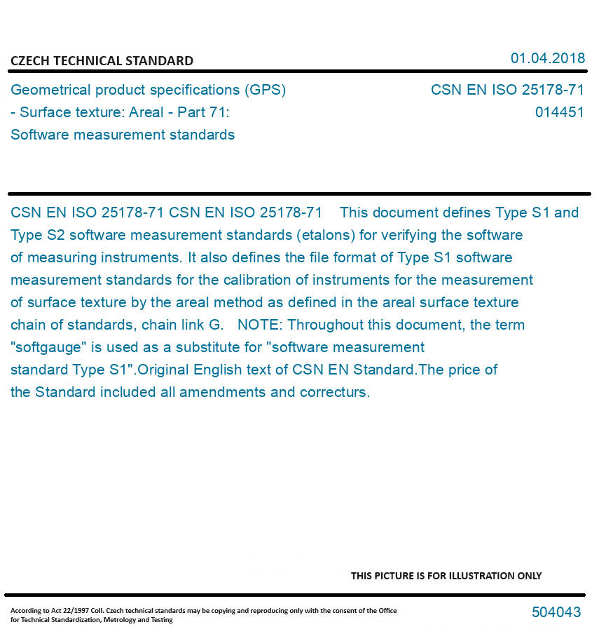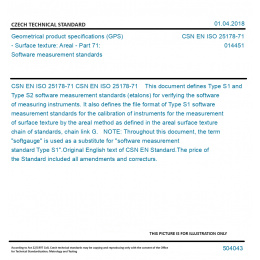 CSN EN ISO 25178-71 This document defines Type S1 and Type S2 software measurement standards (etalons) for verifying the software of measuring instruments. It also defines the file format of Type S1 software measurement standards for the calibration of instruments for the measurement of surface texture by the areal method as defined in the areal surface texture chain of standards, chain link G. NOTE: Throughout this document, the term "softgauge" is used as a substitute for "software measurement standard Type S1". Original English text of CSN EN Standard. The price of the Standard included all amendments and correcturs.