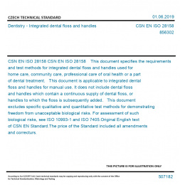 CSN EN ISO 28158 This document specifies the requirements and test methods for integrated dental floss and handles used for home care, community care, professional care of oral health or a part of dental treatment. This document is applicable to integrated dental floss and handles for manual use. It does not include dental floss and handles which contain a continuous supply of dental floss, or handles to which the floss is subsequently added. This document excludes specific qualitative and quantitative test methods for demonstrating freedom from unacceptable biological risks. For assessment of such biological risks, see ISO 10993-1 and ISO 7405. Original English text of CSN EN Standard. The price of the Standard included all amendments and correcturs.