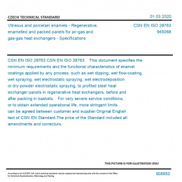 CSN EN ISO 28763 This document specifies the minimum requirements and the functional characteristics of enamel coatings applied by any process, such as wet dipping, wet flow-coating, wet spraying, wet electrostatic spraying, wet electrodeposition or dry-powder electrostatic spraying, to profiled steel heat exchanger panels in regenerative heat exchangers, before and after packing in baskets. For very severe service conditions, or to obtain extended operational life, more stringent limits can be agreed between customer and supplier. Original English text of CSN EN Standard. The price of the Standard included all amendments and correcturs.