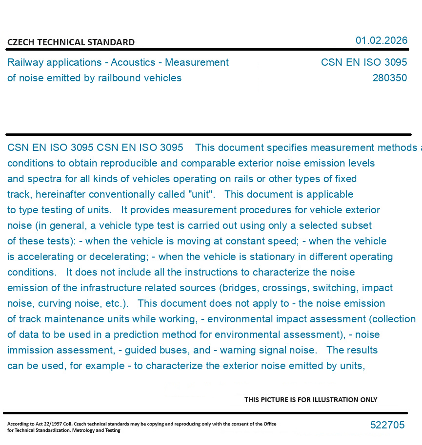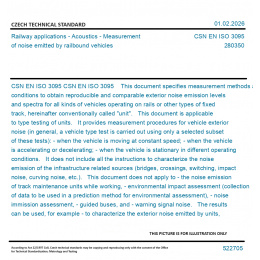 CSN EN ISO 3095 This document specifies measurement methods and conditions to obtain reproducible and comparable exterior noise emission levels and spectra for all kinds of vehicles operating on rails or other types of fixed track, hereinafter conventionally called "unit". This document is applicable to type testing of units. It provides measurement procedures for vehicle exterior noise (in general, a vehicle type test is carried out using only a selected subset of these tests): - when the vehicle is moving at constant speed; - when the vehicle is accelerating or decelerating; - when the vehicle is stationary in different operating conditions. It does not include all the instructions to characterize the noise emission of the infrastructure related sources (bridges, crossings, switching, impact noise, curving noise, etc.). This document does not apply to - the noise emission of track maintenance units while working, - environmental impact assessment (collection of data to be used in a prediction method for environmental assessment), - noise immission assessment, - guided buses, and - warning signal noise. The results can be used, for example - to characterize the exterior noise emitted by units, - to compare the noise emission of various units on a particular track section, and - to collect basic source data for units. NOTE - Additional guidance is provided in Annex E for measurements in the specific case of urban rail vehicles.