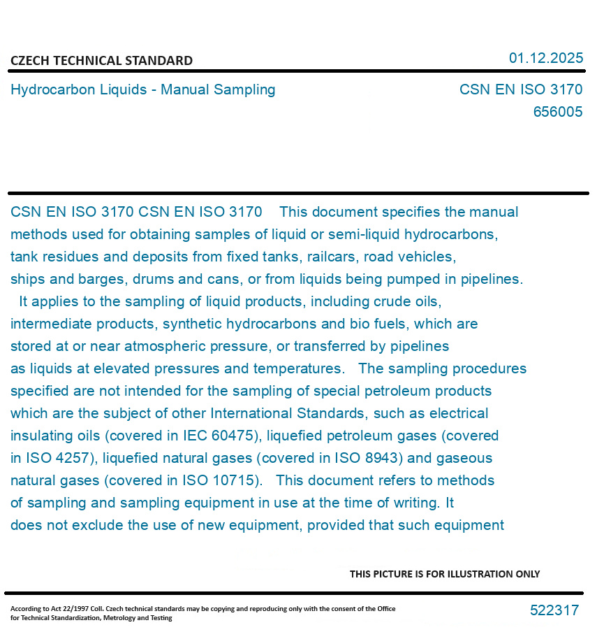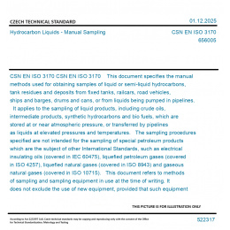 CSN EN ISO 3170 This document specifies the manual methods used for obtaining samples of liquid or semi-liquid hydrocarbons, tank residues and deposits from fixed tanks, railcars, road vehicles, ships and barges, drums and cans, or from liquids being pumped in pipelines. It applies to the sampling of liquid products, including crude oils, intermediate products, synthetic hydrocarbons and bio fuels, which are stored at or near atmospheric pressure, or transferred by pipelines as liquids at elevated pressures and temperatures. The sampling procedures specified are not intended for the sampling of special petroleum products which are the subject of other International Standards, such as electrical insulating oils (covered in IEC 60475), liquefied petroleum gases (covered in ISO 4257), liquefied natural gases (covered in ISO 8943) and gaseous natural gases (covered in ISO 10715). This document refers to methods of sampling and sampling equipment in use at the time of writing. It does not exclude the use of new equipment, provided that such equipment enables samples to be obtained according to the requirements and procedures of this document. Original English text of CSN EN Standard. The price of the Standard included all amendments and correcturs.
