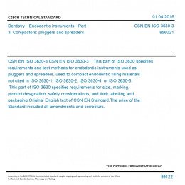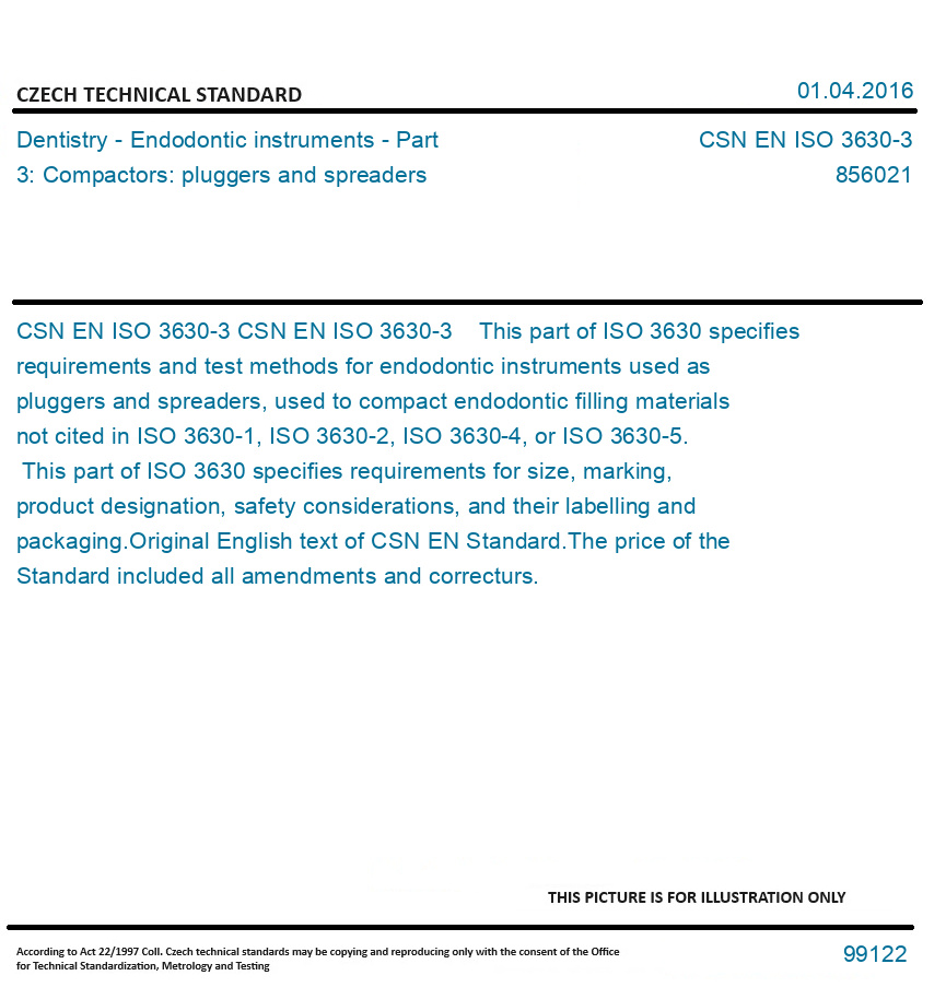 CSN EN ISO 3630-3 This part of ISO 3630 specifies requirements and test methods for endodontic instruments used as pluggers and spreaders, used to compact endodontic filling materials not cited in ISO 3630-1, ISO 3630-2, ISO 3630-4, or ISO 3630-5. This part of ISO 3630 specifies requirements for size, marking, product designation, safety considerations, and their labelling and packaging. Original English text of CSN EN Standard. The price of the Standard included all amendments and correcturs.