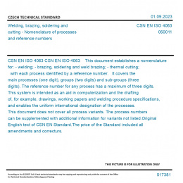 CSN EN ISO 4063 This document establishes a nomenclature for: - welding; - brazing, soldering and weld brazing; - thermal cutting; with each process identified by a reference number. It covers the main processes (one digit), groups (two digits) and sub-groups (three digits). The reference number for any process has a maximum of three digits. This system is intended as an aid in computerization and the drafting of, for example, drawings, working papers and welding procedure specifications, and enables the uniform international designation of the processes. This document does not cover all process variants. The process numbers can be supplemented with additional information for variants not listed. Original English text of CSN EN Standard. The price of the Standard included all amendments and correcturs.
