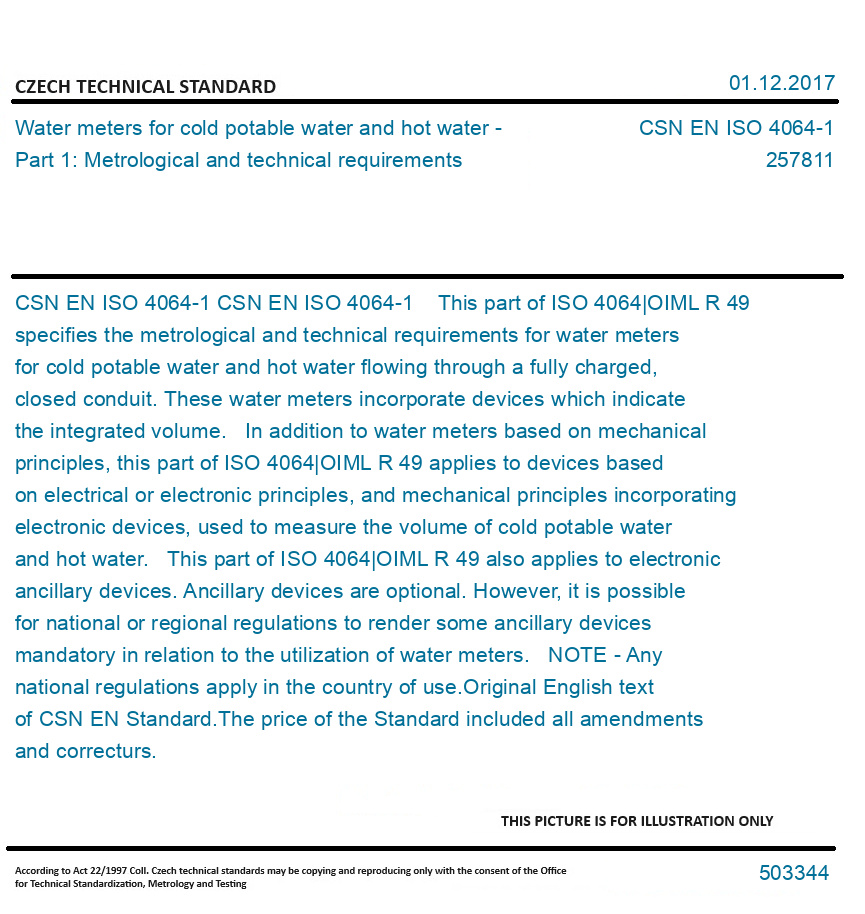 CSN EN ISO 4064-1 This part of ISO 4064|OIML R 49 specifies the metrological and technical requirements for water meters for cold potable water and hot water flowing through a fully charged, closed conduit. These water meters incorporate devices which indicate the integrated volume. In addition to water meters based on mechanical principles, this part of ISO 4064|OIML R 49 applies to devices based on electrical or electronic principles, and mechanical principles incorporating electronic devices, used to measure the volume of cold potable water and hot water. This part of ISO 4064|OIML R 49 also applies to electronic ancillary devices. Ancillary devices are optional. However, it is possible for national or regional regulations to render some ancillary devices mandatory in relation to the utilization of water meters. NOTE - Any national regulations apply in the country of use. Original English text of CSN EN Standard. The price of the Standard included all amendments and correcturs.