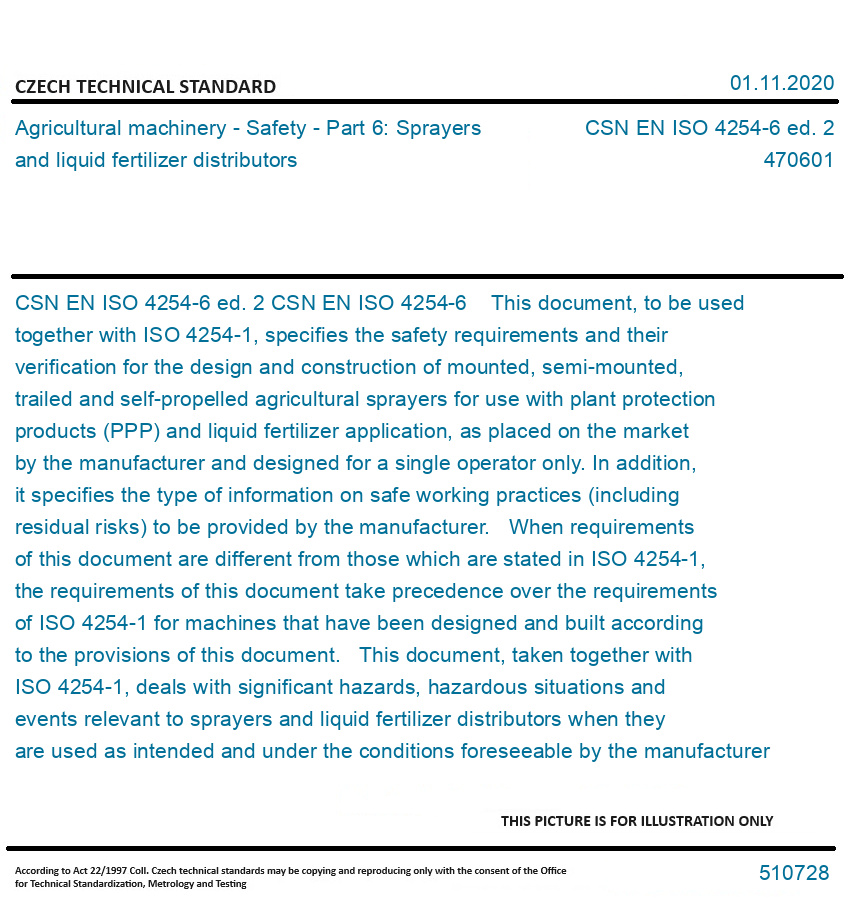 CSN EN ISO 4254-6 This document, to be used together with ISO 4254-1, specifies the safety requirements and their verification for the design and construction of mounted, semi-mounted, trailed and self-propelled agricultural sprayers for use with plant protection products (PPP) and liquid fertilizer application, as placed on the market by the manufacturer and designed for a single operator only. In addition, it specifies the type of information on safe working practices (including residual risks) to be provided by the manufacturer. When requirements of this document are different from those which are stated in ISO 4254-1, the requirements of this document take precedence over the requirements of ISO 4254-1 for machines that have been designed and built according to the provisions of this document. This document, taken together with ISO 4254-1, deals with significant hazards, hazardous situations and events relevant to sprayers and liquid fertilizer distributors when they are used as intended and under the conditions foreseeable by the manufacturer (see Annex A), excepting the hazards arising from: - protection of the driver against spray when spraying (see Foreword); - automatically actuated height adjustment systems; - the environment, other than noise; - moving parts for power transmission except strength requirements for guards and barriers. This document is not applicable to sprayers and liquid fertilizer distributors which are manufactured before the date of publication of this document. Original English text of CSN EN Standard. The price of the Standard included all amendments and correcturs.