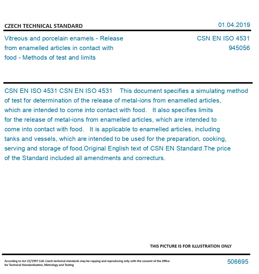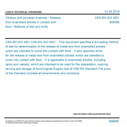 CSN EN ISO 4531 This document specifies a simulating method of test for determination of the release of metal-ions from enamelled articles, which are intended to come into contact with food. It also specifies limits for the release of metal-ions from enamelled articles, which are intended to come into contact with food. It is applicable to enamelled articles, including tanks and vessels, which are intended to be used for the preparation, cooking, serving and storage of food. Original English text of CSN EN Standard. The price of the Standard included all amendments and correcturs.