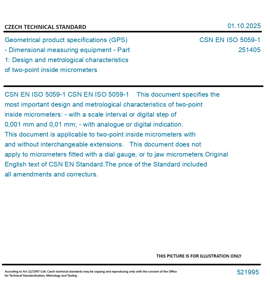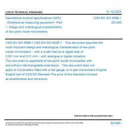 CSN EN ISO 5059-1 This document specifies the most important design and metrological characteristics of two-point inside micrometers: - with a scale interval or digital step of 0,001 mm and 0,01 mm; - with analogue or digital indication. This document is applicable to two-point inside micrometers with and without interchangeable extensions. This document does not apply to micrometers fitted with a dial gauge, or to jaw micrometers. Original English text of CSN EN Standard. The price of the Standard included all amendments and correcturs.