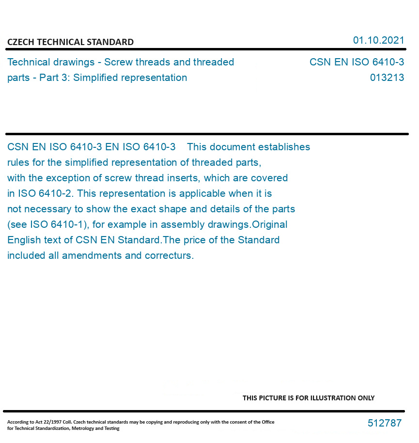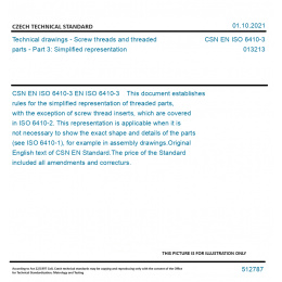 EN ISO 6410-3 This document establishes rules for the simplified representation of threaded parts, with the exception of screw thread inserts, which are covered in ISO 6410-2. This representation is applicable when it is not necessary to show the exact shape and details of the parts (see ISO 6410-1), for example in assembly drawings. Original English text of CSN EN Standard. The price of the Standard included all amendments and correcturs.