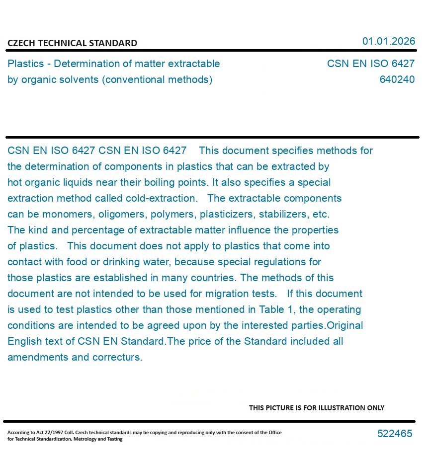 CSN EN ISO 6427 This document specifies methods for the determination of components in plastics that can be extracted by hot organic liquids near their boiling points. It also specifies a special extraction method called cold-extraction. The extractable components can be monomers, oligomers, polymers, plasticizers, stabilizers, etc. The kind and percentage of extractable matter influence the properties of plastics. This document does not apply to plastics that come into contact with food or drinking water, because special regulations for those plastics are established in many countries. The methods of this document are not intended to be used for migration tests. If this document is used to test plastics other than those mentioned in Table 1, the operating conditions are intended to be agreed upon by the interested parties.