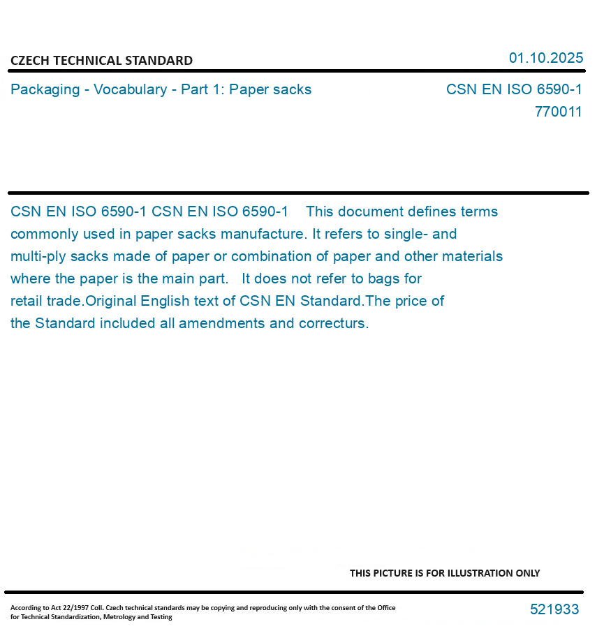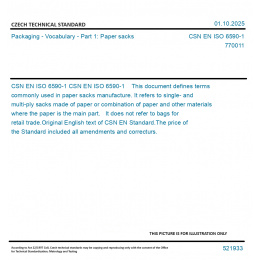 CSN EN ISO 6590-1 This document defines terms commonly used in paper sacks manufacture. It refers to single- and multi-ply sacks made of paper or combination of paper and other materials where the paper is the main part. It does not refer to bags for retail trade. Original English text of CSN EN Standard. The price of the Standard included all amendments and correcturs.