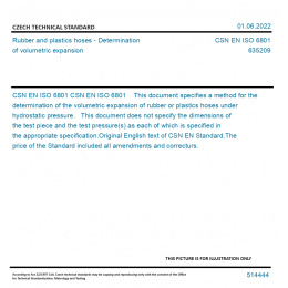 CSN EN ISO 6801 This document specifies a method for the determination of the volumetric expansion of rubber or plastics hoses under hydrostatic pressure. This document does not specify the dimensions of the test piece and the test pressure(s) as each of which is specified in the appropriate specification. Original English text of CSN EN Standard. The price of the Standard included all amendments and correcturs.
