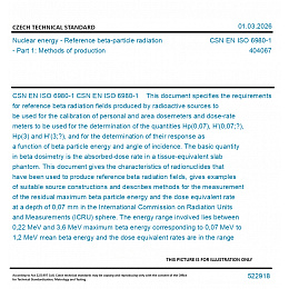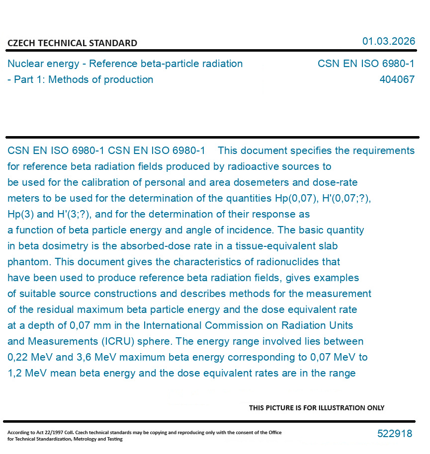 CSN EN ISO 6980-1 This document specifies the requirements for reference beta radiation fields produced by radioactive sources to be used for the calibration of personal and area dosemeters and dose-rate meters to be used for the determination of the quantities Hp(0,07), H'(0,07;?), Hp(3) and H'(3;?), and for the determination of their response as a function of beta particle energy and angle of incidence. The basic quantity in beta dosimetry is the absorbed-dose rate in a tissue-equivalent slab phantom. This document gives the characteristics of radionuclides that have been used to produce reference beta radiation fields, gives examples of suitable source constructions and describes methods for the measurement of the residual maximum beta particle energy and the dose equivalent rate at a depth of 0,07 mm in the International Commission on Radiation Units and Measurements (ICRU) sphere. The energy range involved lies between 0,22 MeV and 3,6 MeV maximum beta energy corresponding to 0,07 MeV to 1,2 MeV mean beta energy and the dose equivalent rates are in the range from about 10 ?Sv˙h-1 to at least 101 Sv˙h-1.In addition, for some sources, variations of the dose equivalent rate as a function of the angle of incidence are given. However, as noted in ICRU 56, the ambient dose equivalent, H*(10), used for area monitoring, and the personal dose equivalent, Hp(10), as used for individual monitoring, of strongly penetrating radiation, are not appropriate quantities for any beta radiation, even that which penetrates 10 mm of tissue (Emax > 2 MeV). This document is applicable to two series of reference beta radiation fields, from which the radiation necessary for determining the characteristics (calibration and energy and angular dependence of response) of an instrument can be selected. Series 1 reference radiation fields are produced by radioactive sources used with beam-flattening filters designed to give uniform dose equivalent rates over a large area at a specified distance. The proposed sources of 106Ru/106Rh, 90Sr/90Y, 85Kr, 204Tl and 147Pm produce maximum dose equivalent rates of approximately 200 mSv˙h-1. Series 2 reference radiation fields are produced without the use of beam-flattening filters, which allows large area planar sources and a range of source-to-calibration plane distances to be used. Close to the sources, only relatively small areas of uniform dose rate are produced, but this series has the advantage of extending the energy and dose rate ranges beyond those of series 1. The series also include radiation fields using polymethylmethacrylate (PMMA) absorbers to reduce the maximum beta particle energy. The radionuclides used are those of series 1; these sources produce dose equivalent rates of up to 10 Sv˙h-1.