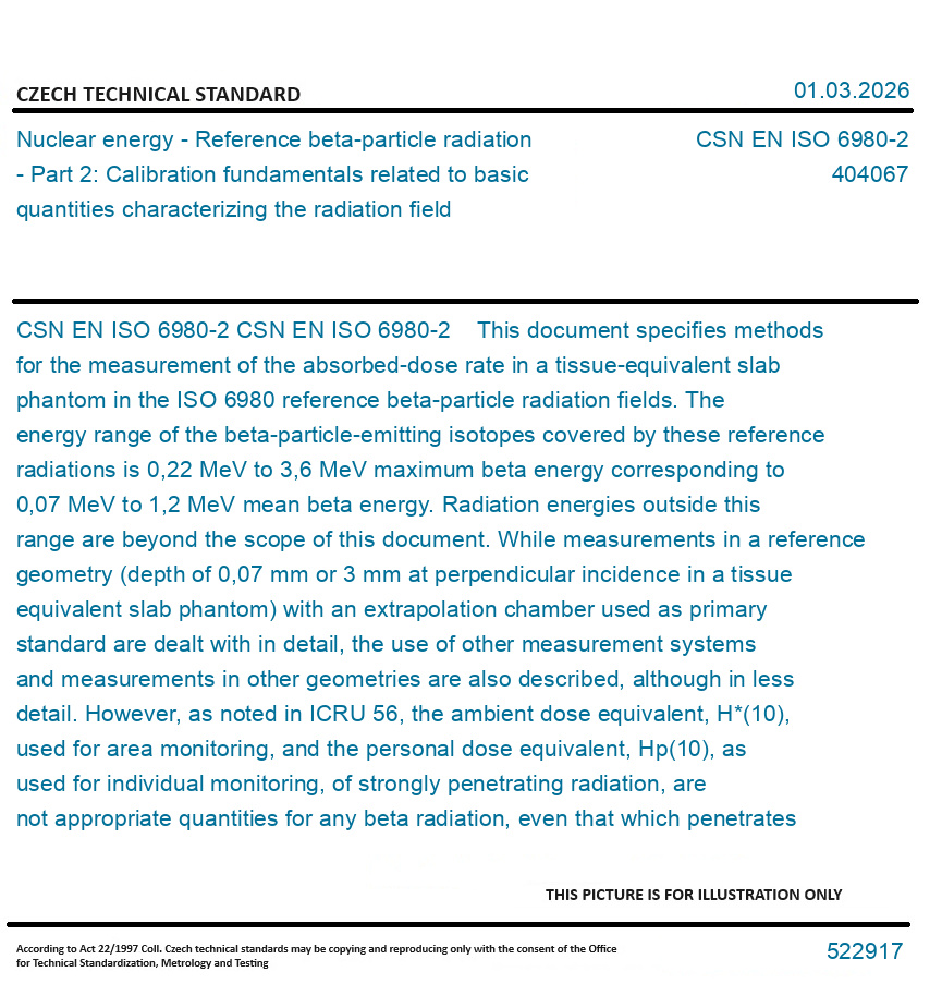 CSN EN ISO 6980-2 This document specifies methods for the measurement of the absorbed-dose rate in a tissue-equivalent slab phantom in the ISO 6980 reference beta-particle radiation fields. The energy range of the beta-particle-emitting isotopes covered by these reference radiations is 0,22 MeV to 3,6 MeV maximum beta energy corresponding to 0,07 MeV to 1,2 MeV mean beta energy. Radiation energies outside this range are beyond the scope of this document. While measurements in a reference geometry (depth of 0,07 mm or 3 mm at perpendicular incidence in a tissue equivalent slab phantom) with an extrapolation chamber used as primary standard are dealt with in detail, the use of other measurement systems and measurements in other geometries are also described, although in less detail. However, as noted in ICRU 56, the ambient dose equivalent, H*(10), used for area monitoring, and the personal dose equivalent, Hp(10), as used for individual monitoring, of strongly penetrating radiation, are not appropriate quantities for any beta radiation, even that which penetrates 10 mm of tissue (Emax > 2 MeV). This document is intended for those organizations wishing to establish primary dosimetry capabilities for beta particles and serves as a guide to the performance of dosimetry with an extrapolation chamber used as primary standard for beta particle dosimetry in other fields. Guidance is also provided on the statement of measurement uncertainties.