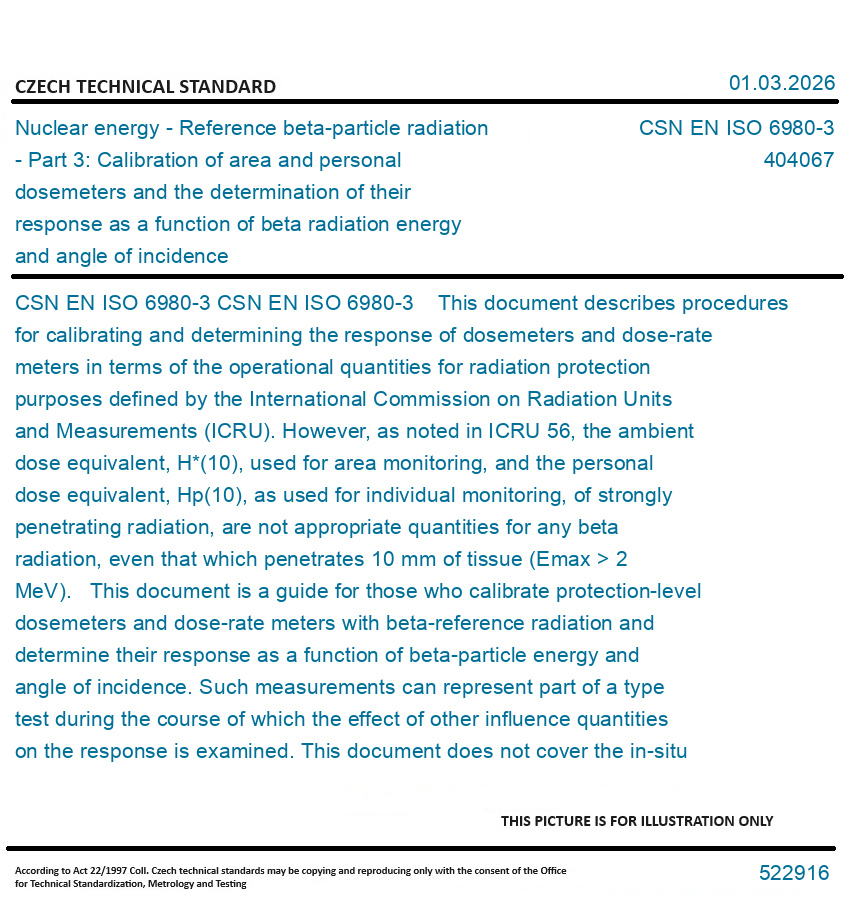 CSN EN ISO 6980-3 This document describes procedures for calibrating and determining the response of dosemeters and dose-rate meters in terms of the operational quantities for radiation protection purposes defined by the International Commission on Radiation Units and Measurements (ICRU). However, as noted in ICRU 56, the ambient dose equivalent, H*(10), used for area monitoring, and the personal dose equivalent, Hp(10), as used for individual monitoring, of strongly penetrating radiation, are not appropriate quantities for any beta radiation, even that which penetrates 10 mm of tissue (Emax > 2 MeV). This document is a guide for those who calibrate protection-level dosemeters and dose-rate meters with beta-reference radiation and determine their response as a function of beta-particle energy and angle of incidence. Such measurements can represent part of a type test during the course of which the effect of other influence quantities on the response is examined. This document does not cover the in-situ calibration of fixed, installed area dosemeters. The term "dosemeter" is used as a generic term denoting any dose or dose-rate meter for individual or area monitoring. In addition to the description of calibration procedures, this document includes recommendations for appropriate phantoms and the way to determine appropriate conversion coefficients. Guidance is provided on the statement of measurement uncertainties and the preparation of calibration records and certificates.