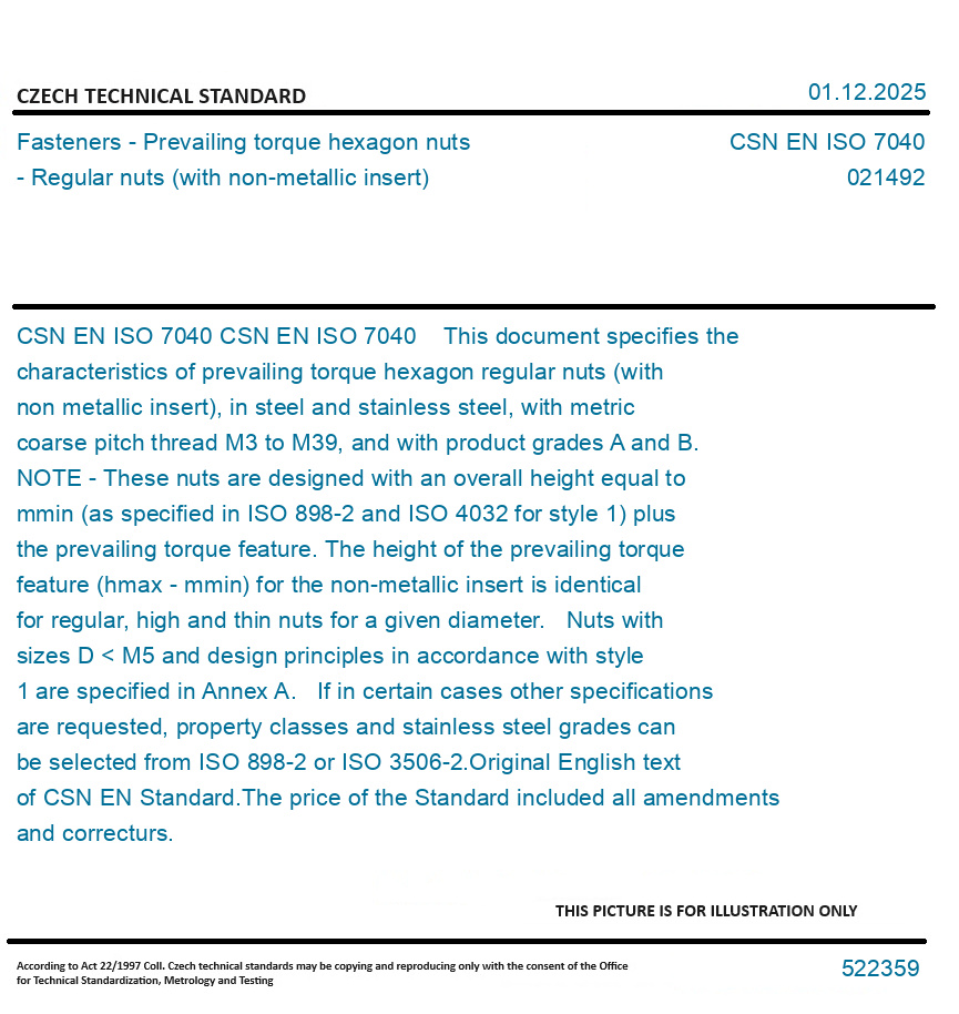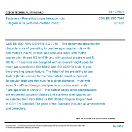 CSN EN ISO 7040 This document specifies the characteristics of prevailing torque hexagon regular nuts (with non metallic insert), in steel and stainless steel, with metric coarse pitch thread M3 to M39, and with product grades A and B. NOTE - These nuts are designed with an overall height equal to mmin (as specified in ISO 898-2 and ISO 4032 for style 1) plus the prevailing torque feature. The height of the prevailing torque feature (hmax - mmin) for the non-metallic insert is identical for regular, high and thin nuts for a given diameter. Nuts with sizes D < M5 and design principles in accordance with style 1 are specified in Annex A. If in certain cases other specifications are requested, property classes and stainless steel grades can be selected from ISO 898-2 or ISO 3506-2. Original English text of CSN EN Standard. The price of the Standard included all amendments and correcturs.