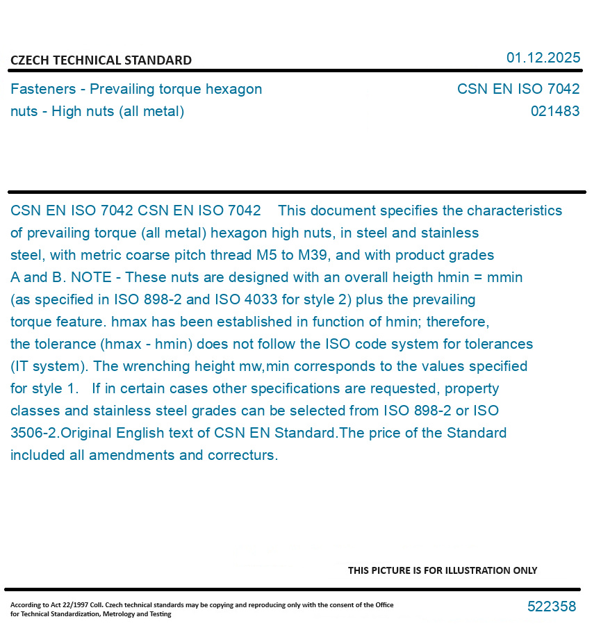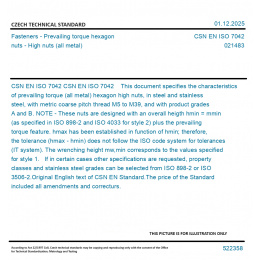 CSN EN ISO 7042 This document specifies the characteristics of prevailing torque (all metal) hexagon high nuts, in steel and stainless steel, with metric coarse pitch thread M5 to M39, and with product grades A and B. NOTE - These nuts are designed with an overall heigth hmin = mmin (as specified in ISO 898-2 and ISO 4033 for style 2) plus the prevailing torque feature. hmax has been established in function of hmin; therefore, the tolerance (hmax - hmin) does not follow the ISO code system for tolerances (IT system). The wrenching height mw,min corresponds to the values specified for style 1. If in certain cases other specifications are requested, property classes and stainless steel grades can be selected from ISO 898-2 or ISO 3506-2. Original English text of CSN EN Standard. The price of the Standard included all amendments and correcturs.
