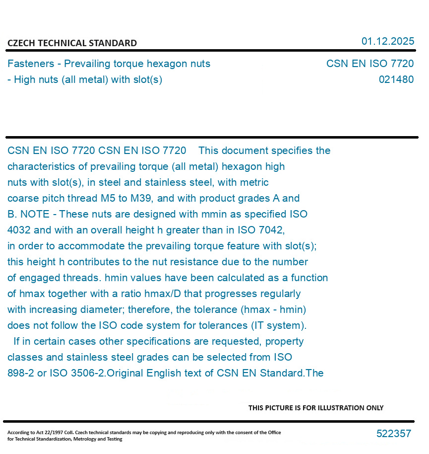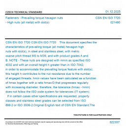 CSN EN ISO 7720 This document specifies the characteristics of prevailing torque (all metal) hexagon high nuts with slot(s), in steel and stainless steel, with metric coarse pitch thread M5 to M39, and with product grades A and B. NOTE - These nuts are designed with mmin as specified ISO 4032 and with an overall height h greater than in ISO 7042, in order to accommodate the prevailing torque feature with slot(s); this height h contributes to the nut resistance due to the number of engaged threads. hmin values have been calculated as a function of hmax together with a ratio hmax/D that progresses regularly with increasing diameter; therefore, the tolerance (hmax - hmin) does not follow the ISO code system for tolerances (IT system). If in certain cases other specifications are requested, property classes and stainless steel grades can be selected from ISO 898-2 or ISO 3506-2. Original English text of CSN EN Standard. The price of the Standard included all amendments and correcturs.