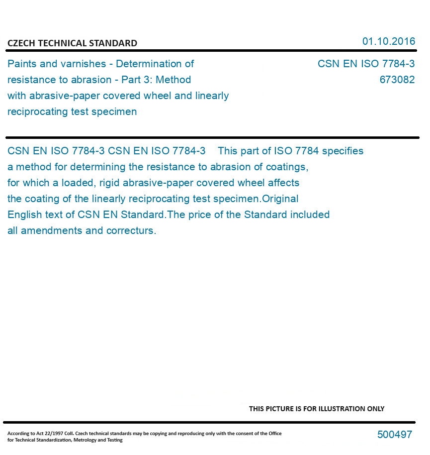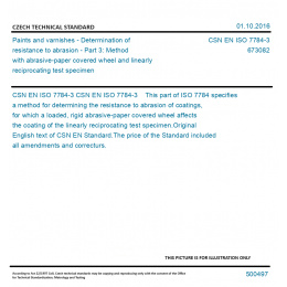 CSN EN ISO 7784-3 This part of ISO 7784 specifies a method for determining the resistance to abrasion of coatings, for which a loaded, rigid abrasive-paper covered wheel affects the coating of the linearly reciprocating test specimen. Original English text of CSN EN Standard. The price of the Standard included all amendments and correcturs.