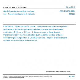 CSN EN ISO 7864 This International Standard specifies requirements for sterile hypodermic needles for single use of designated metric sizes 0,18 mm to 1,2 mm. It does not apply to those devices that are covered by their own standard such as dental needles and pen needles. Original English text of CSN EN Standard. The price of the Standard included all amendments and correcturs.