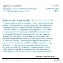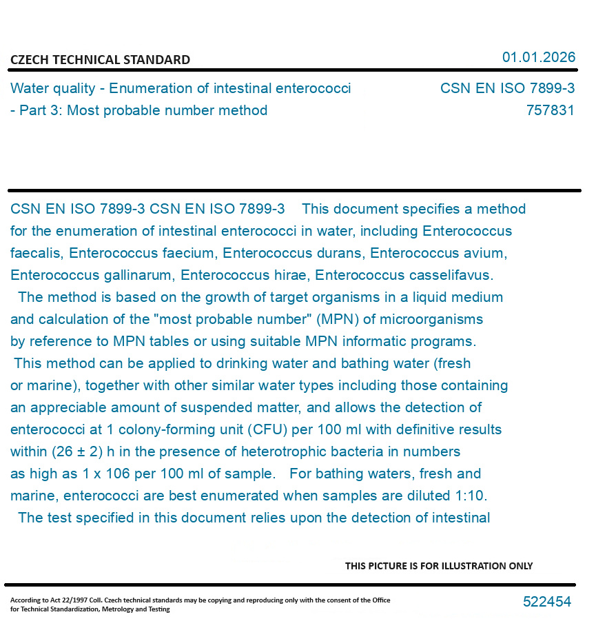 CSN EN ISO 7899-3 This document specifies a method for the enumeration of intestinal enterococci in water, including Enterococcus faecalis, Enterococcus faecium, Enterococcus durans, Enterococcus avium, Enterococcus gallinarum, Enterococcus hirae, Enterococcus casselifavus. The method is based on the growth of target organisms in a liquid medium and calculation of the "most probable number" (MPN) of microorganisms by reference to MPN tables or using suitable MPN informatic programs. This method can be applied to drinking water and bathing water (fresh or marine), together with other similar water types including those containing an appreciable amount of suspended matter, and allows the detection of enterococci at 1 colony-forming unit (CFU) per 100 ml with definitive results within (26 ± 2) h in the presence of heterotrophic bacteria in numbers as high as 1 x 106 per 100 ml of sample. For bathing waters, fresh and marine, enterococci are best enumerated when samples are diluted 1:10. The test specified in this document relies upon the detection of intestinal enterococci based upon expression of the enzyme ß-D-glucosidase and provides a confirmed result in 24 h without further testing of positive wells. This document does not apply to bottled waters, for which the method has not been validated and therefore is outside the scope of this document, unless appropriate validation of performance of this method has been undertaken by the laboratory prior to use.