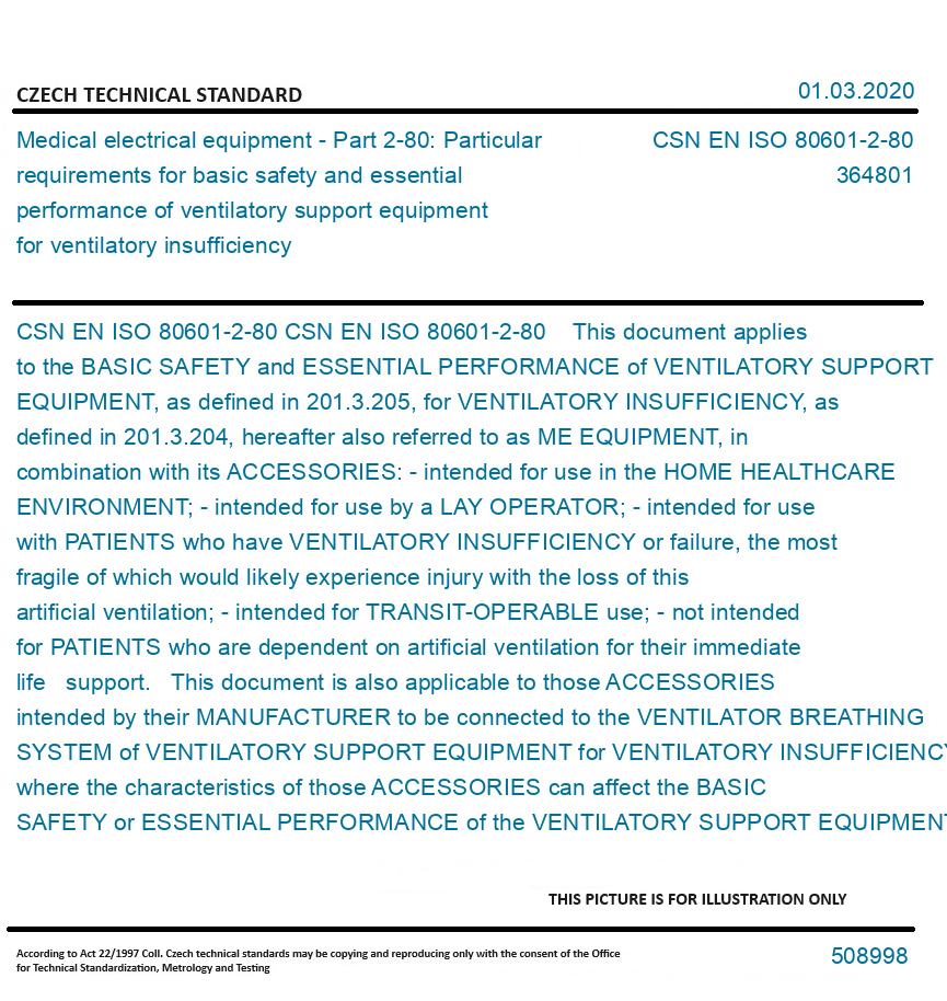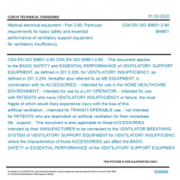 CSN EN ISO 80601-2-80 This document applies to the BASIC SAFETY and ESSENTIAL PERFORMANCE of VENTILATORY SUPPORT EQUIPMENT, as defined in 201.3.205, for VENTILATORY INSUFFICIENCY, as defined in 201.3.204, hereafter also referred to as ME EQUIPMENT, in combination with its ACCESSORIES: - intended for use in the HOME HEALTHCARE ENVIRONMENT; - intended for use by a LAY OPERATOR; - intended for use with PATIENTS who have VENTILATORY INSUFFICIENCY or failure, the most fragile of which would likely experience injury with the loss of this artificial ventilation; - intended for TRANSIT-OPERABLE use; - not intended for PATIENTS who are dependent on artificial ventilation for their immediate life support. This document is also applicable to those ACCESSORIES intended by their MANUFACTURER to be connected to the VENTILATOR BREATHING SYSTEM of VENTILATORY SUPPORT EQUIPMENT for VENTILATORY INSUFFICIENCY, where the characteristics of those ACCESSORIES can affect the BASIC SAFETY or ESSENTIAL PERFORMANCE of the VENTILATORY SUPPORT EQUIPMENT for VENTILATORY INSUFFICIENCY. Original English text of CSN EN Standard. The price of the Standard included all amendments and correcturs.