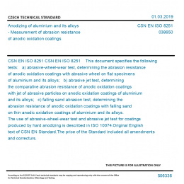 CSN EN ISO 8251 This document specifies the following tests: a) abrasive-wheel-wear test, determining the abrasion resistance of anodic oxidation coatings with abrasive wheel on flat specimens of aluminium and its alloys; b) abrasive jet test, determining the comparative abrasion resistance of anodic oxidation coatings with jet of abrasive particles on anodic oxidation coatings of aluminium and its alloys; c) falling sand abrasion test, determining the abrasion resistance of anodic oxidation coatings with falling sand on thin anodic oxidation coatings of aluminium and its alloys. The use of abrasive-wheel-wear test and abrasive jet test for coatings produced by hard anodizing is described in ISO 10074. Original English text of CSN EN Standard. The price of the Standard included all amendments and correcturs.
