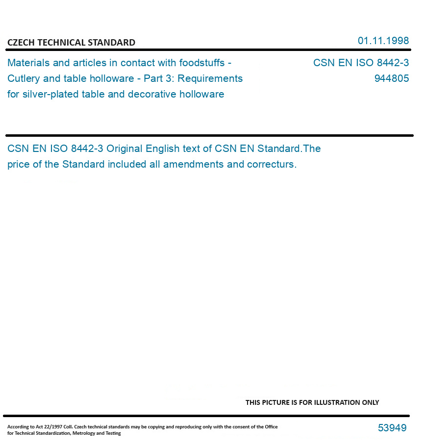 CSN EN ISO 8442-3 Materials and articles in contact with foodstuffs - Cutlery and table holloware - Part 3: Requirements for silver-plated table and decorative holloware