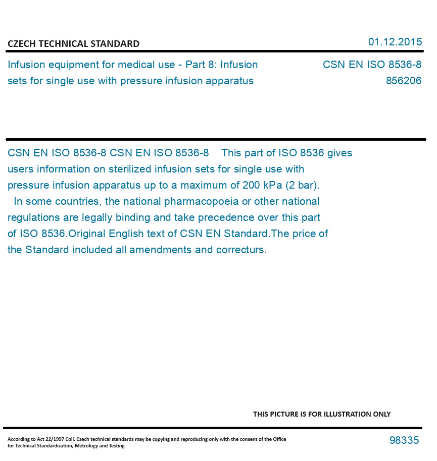CSN EN ISO 8536-8 This part of ISO 8536 gives users information on sterilized infusion sets for single use with pressure infusion apparatus up to a maximum of 200 kPa (2 bar). In some countries, the national pharmacopoeia or other national regulations are legally binding and take precedence over this part of ISO 8536. Original English text of CSN EN Standard. The price of the Standard included all amendments and correcturs.