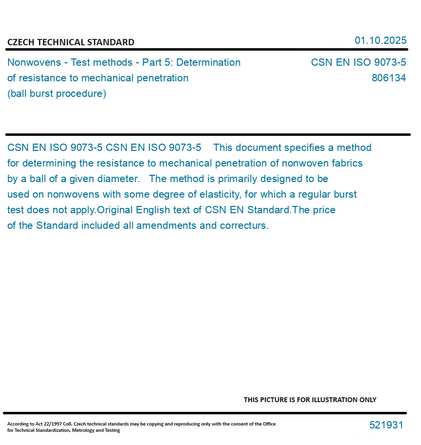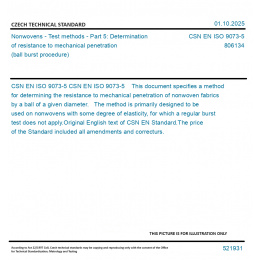 CSN EN ISO 9073-5 This document specifies a method for determining the resistance to mechanical penetration of nonwoven fabrics by a ball of a given diameter. The method is primarily designed to be used on nonwovens with some degree of elasticity, for which a regular burst test does not apply. Original English text of CSN EN Standard. The price of the Standard included all amendments and correcturs.