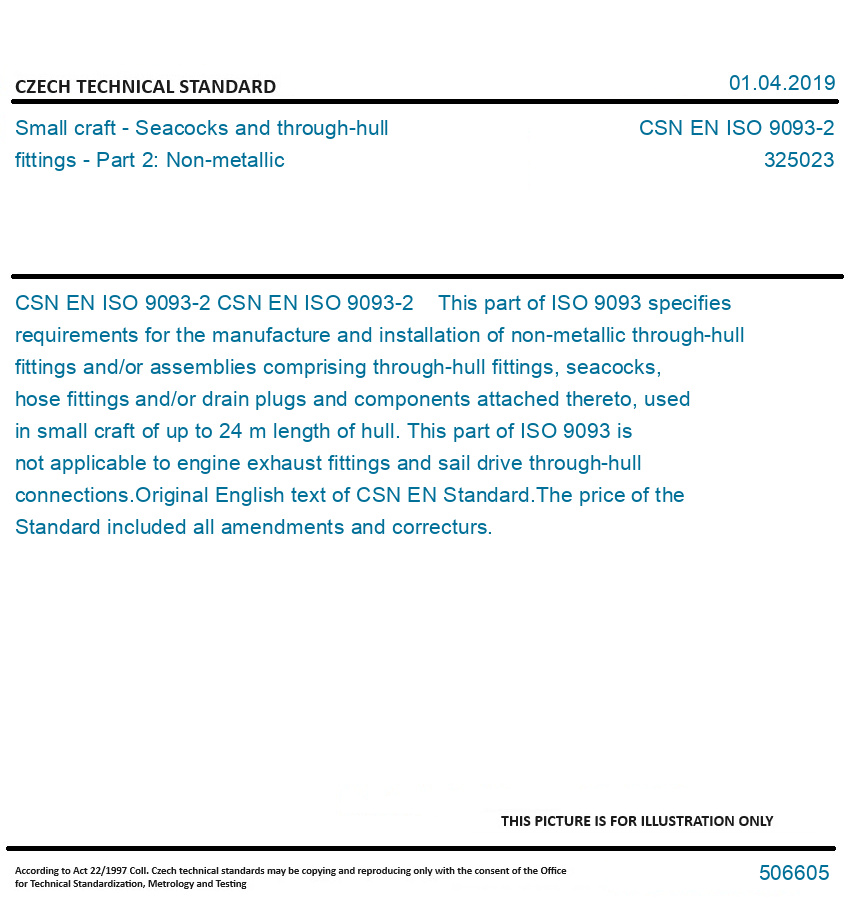 CSN EN ISO 9093-2 This part of ISO 9093 specifies requirements for the manufacture and installation of non-metallic through-hull fittings and/or assemblies comprising through-hull fittings, seacocks, hose fittings and/or drain plugs and components attached thereto, used in small craft of up to 24 m length of hull. This part of ISO 9093 is not applicable to engine exhaust fittings and sail drive through-hull connections. Original English text of CSN EN Standard. The price of the Standard included all amendments and correcturs.