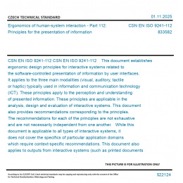 CSN EN ISO 9241-112 This document establishes ergonomic design principles for interactive systems related to the software-controlled presentation of information by user interfaces. It applies to the three main modalities (visual, auditory, tactile or haptic) typically used in information and communication technology (ICT). These principles apply to the perception and understanding of presented information. These principles are applicable in the analysis, design and evaluation of interactive systems. This document also provides recommendations corresponding to the principles. The recommendations for each of the principles are not exhaustive and are not necessarily independent from one another. While this document is applicable to all types of interactive systems, it does not cover the specifics of particular application domains which require context-specific recommendations. This document also applies to outputs from interactive systems (such as printed documents and document exports in common computer formats, e.g. pdf, text and tabular formats). Original English text of CSN EN Standard. The price of the Standard included all amendments and correcturs.