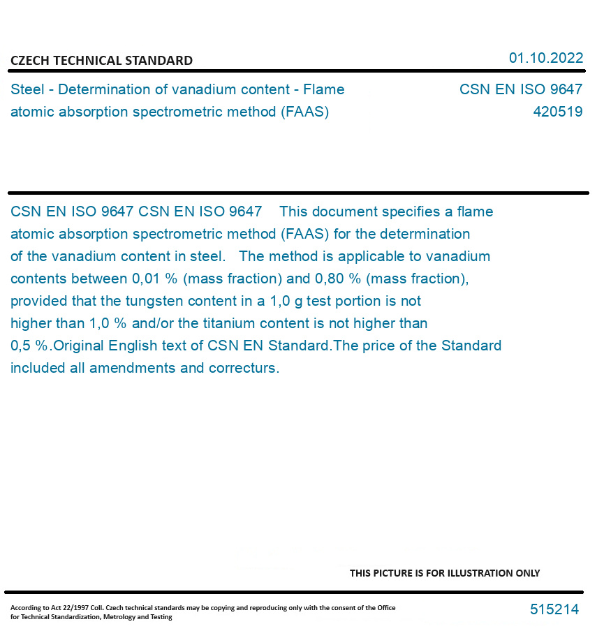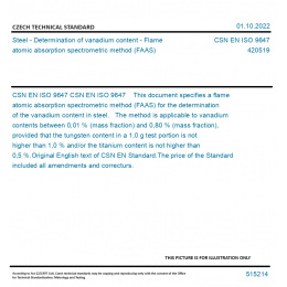 CSN EN ISO 9647 This document specifies a flame atomic absorption spectrometric method (FAAS) for the determination of the vanadium content in steel. The method is applicable to vanadium contents between 0,01 % (mass fraction) and 0,80 % (mass fraction), provided that the tungsten content in a 1,0 g test portion is not higher than 1,0 % and/or the titanium content is not higher than 0,5 %. Original English text of CSN EN Standard. The price of the Standard included all amendments and correcturs.