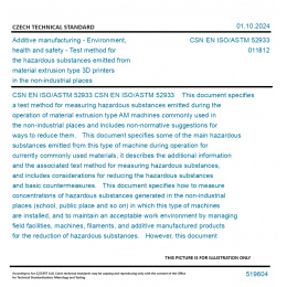>CSN Standards>01 GENERAL CLASS>0118 >CSN EN ISO/ASTM 52933 - Additive manufacturing - Environment, health and safety - Test method for the hazardous substances emitted from material extrusion type 3D printers in the non-industrial places