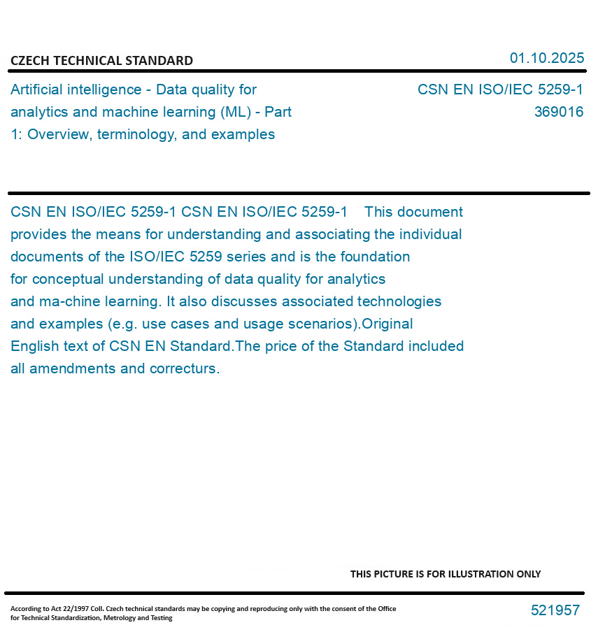 CSN EN ISO/IEC 5259-1 This document provides the means for understanding and associating the individual documents of the ISO/IEC 5259 series and is the foundation for conceptual understanding of data quality for analytics and ma-chine learning. It also discusses associated technologies and examples (e.g. use cases and usage scenarios). Original English text of CSN EN Standard. The price of the Standard included all amendments and correcturs.