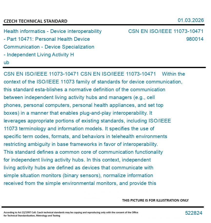CSN EN ISO/IEEE 11073-10471 Within the context of the ISO/IEEE 11073 family of standards for device communication, this standard esta-blishes a normative definition of the communication between independent living activity hubs and managers (e.g., cell phones, personal computers, personal health appliances, and set top boxes) in a manner that enables plug-and-play interoperability. It leverages appropriate portions of existing standards, including ISO/IEEE 11073 terminology and information models. It specifies the use of specific term codes, formats, and behaviors in telehealth environments restricting ambiguity in base frameworks in favor of interoperability. This standard defines a common core of communication functionality for independent living activity hubs. In this context, independent living activity hubs are defined as devices that communicate with simple situation monitors (binary sensors), normalize information received from the simple environmental monitors, and provide this normalized information to one or more managers. This information can be examined, for example, to determine when a person's activities/behaviors have deviated significantly from what is normal for them such that relevant parties can be notified. Independent living activity hubs will normalize information from the following simple situation monitors (binary sensors) for the initial release of the proposed standard: fall sensor, motion sensor, door sensor, bed/chair occupancy sensor, light switch sensor, smoke sensor, (ambient) temperature threshold sensor, personal emergency response system (PERS), and enuresis sensor (bed-wetting).
