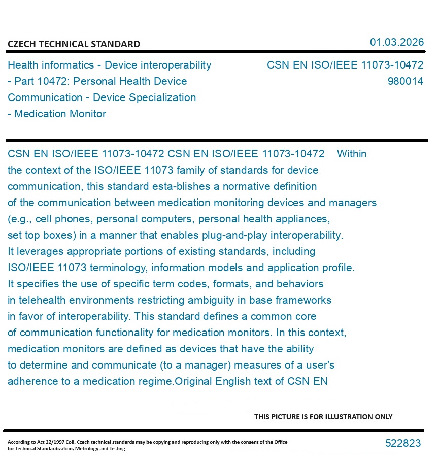 CSN EN ISO/IEEE 11073-10472 Within the context of the ISO/IEEE 11073 family of standards for device communication, this standard esta-blishes a normative definition of the communication between medication monitoring devices and managers (e.g., cell phones, personal computers, personal health appliances, set top boxes) in a manner that enables plug-and-play interoperability. It leverages appropriate portions of existing standards, including ISO/IEEE 11073 terminology, information models and application profile. It specifies the use of specific term codes, formats, and behaviors in telehealth environments restricting ambiguity in base frameworks in favor of interoperability. This standard defines a common core of communication functionality for medication monitors. In this context, medication monitors are defined as devices that have the ability to determine and communicate (to a manager) measures of a user's adherence to a medication regime.