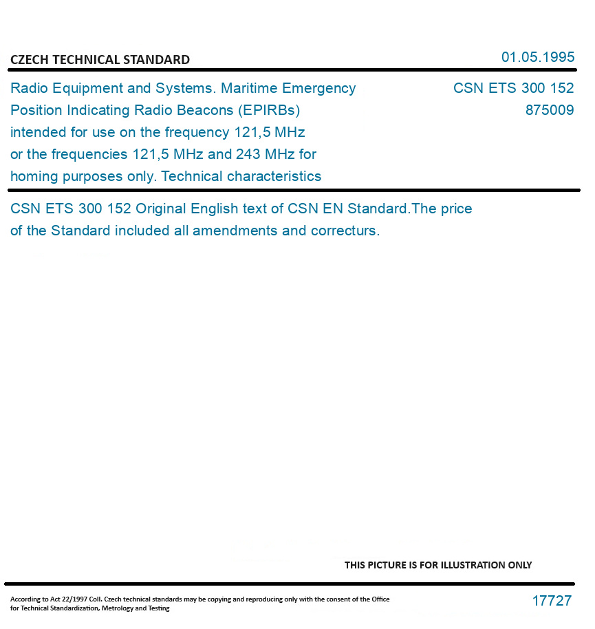 >CSN Standards>87 TELECOMMUNICATIONS>8750 Radio equipment and systems. EMS and radio spectrum>CSN ETS 300 152 - Radio Equipment and Systems. Maritime Emergency Position Indicating Radio Beacons (EPIRBs) intended for use on the frequency 121,5 MHz or the frequencies 121,5 MHz and 243 MHz for homing purposes only. Technical characteristics and methods of measurement