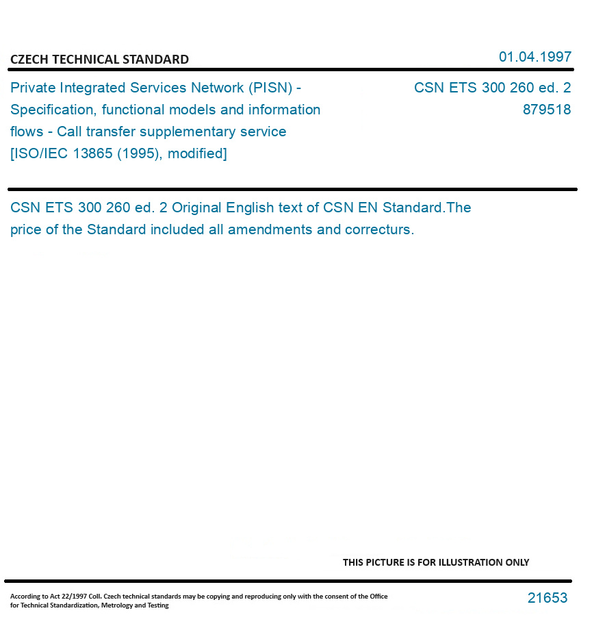 ![CSN ETS 300 260 ed. 2 - Private Integrated Services Network (PISN) - Specification, functional models and information flows - Call transfer supplementary service [ISO/IEC 13865 (1995), modified] CSN ETS 300 260 ed. 2 - Private Integrated Services Network (PISN) - Specification, functional models and information flows - Call transfer supplementary service [ISO/IEC 13865 (1995), modified]](https://www.en-standard.eu/imgcache/7/f/pi520-22576-en-CSN-ETS-300-260-ed-2-Private-I_96_96_77492.jpg)