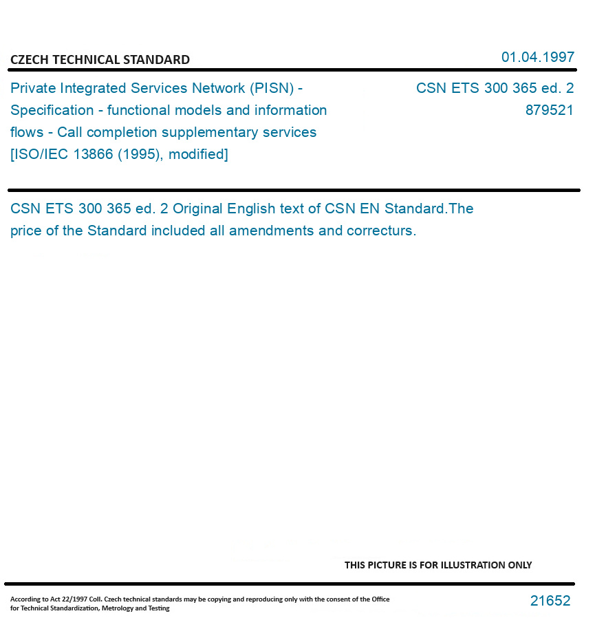 ![CSN ETS 300 365 ed. 2 - Private Integrated Services Network (PISN) - Specification - functional models and information flows - Call completion supplementary services [ISO/IEC 13866 (1995), modified] CSN ETS 300 365 ed. 2 - Private Integrated Services Network (PISN) - Specification - functional models and information flows - Call completion supplementary services [ISO/IEC 13866 (1995), modified]](https://www.en-standard.eu/imgcache/c/f/pi520-22577-en-CSN-ETS-300-365-ed-2-Private-I_96_96_77886.jpg)