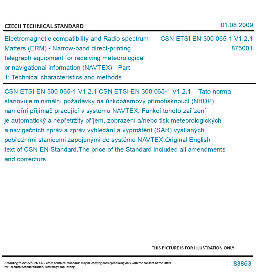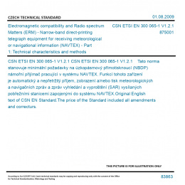 CSN ETSI EN 300 065-1 V1.2.1 Tato norma stanovuje minimální požadavky na úzkopásmový přímotisknoucí (NBDP) námořní přijímač pracující v systému NAVTEX. Funkcí tohoto zařízení je automatický a nepřetržitý příjem, zobrazení a/nebo tisk meteorologických a navigačních zpráv a zpráv vyhledání a vyproštění (SAR) vysílaných pobřežními stanicemi zapojenými do systému NAVTEX. Original English text of CSN EN Standard. The price of the Standard included all amendments and correcturs.