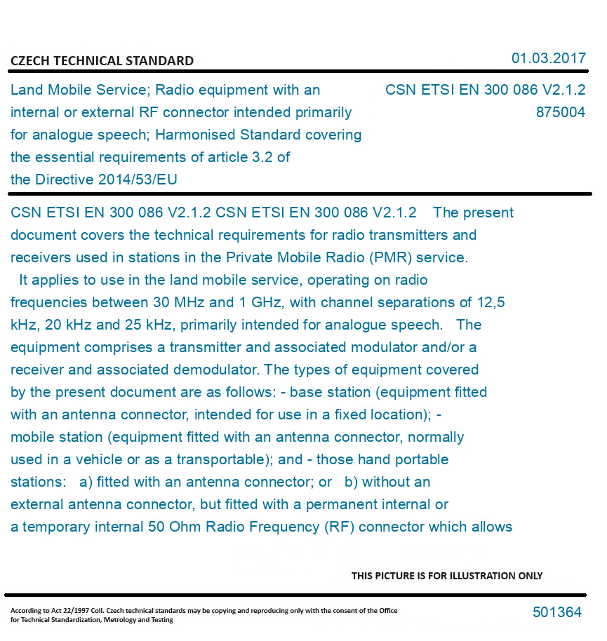 CSN ETSI EN 300 086 V2.1.2 The present document covers the technical requirements for radio transmitters and receivers used in stations in the Private Mobile Radio (PMR) service. It applies to use in the land mobile service, operating on radio frequencies between 30 MHz and 1 GHz, with channel separations of 12,5 kHz, 20 kHz and 25 kHz, primarily intended for analogue speech. The equipment comprises a transmitter and associated modulator and/or a receiver and associated demodulator. The types of equipment covered by the present document are as follows: - base station (equipment fitted with an antenna connector, intended for use in a fixed location); - mobile station (equipment fitted with an antenna connector, normally used in a vehicle or as a transportable); and - those hand portable stations: a) fitted with an antenna connector; or b) without an external antenna connector, but fitted with a permanent internal or a temporary internal 50 Ohm Radio Frequency (RF) connector which allows access to the transmitter output and the receiver input. Note - Hand portable equipment without an external or internal RF connector and without the possibility of having a temporary internal 50 RF connector is not covered by the present document (integral antenna equipment is covered by ETSI EN 300 296 [i.1]). The present document contains requirements to demonstrate that "... radio equipment shall be so constructed that it both effectively uses and supports the efficient use of radio spectrum in order to avoid harmful interference" and that "....radio equipment supports certain features ensuring access to emergency services" [i.7]. In addition to the present document, other ENs that specify technical requirements in respect of essential requirements under other parts of article 3 of the Radio Equipment Directive [i.7] may apply to equipment within the scope of the present document. Original English text of CSN EN Standard. The price of the Standard included all amendments and correcturs.