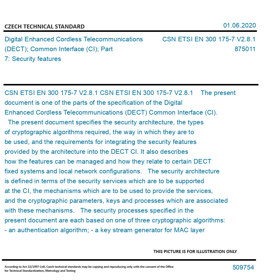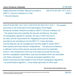 CSN ETSI EN 300 175-7 V2.8.1 The present document is one of the parts of the specification of the Digital Enhanced Cordless Telecommunications (DECT) Common Interface (CI). The present document specifies the security architecture, the types of cryptographic algorithms required, the way in which they are to be used, and the requirements for integrating the security features provided by the architecture into the DECT CI. It also describes how the features can be managed and how they relate to certain DECT fixed systems and local network configurations. The security architecture is defined in terms of the security services which are to be supported at the CI, the mechanisms which are to be used to provide the services, and the cryptographic parameters, keys and processes which are associated with these mechanisms. The security processes specified in the present document are each based on one of three cryptographic algorithms: - an authentication algorithm; - a key stream generator for MAC layer encryption; and - a key stream generator plus a Message Authentication Code generator for CCM authenticated encryption. The architecture is, however, algorithm independent, and either the DECT standard algorithms, or appropriate proprietary algorithms, or indeed a combination of both can, in principle, be employed. The use of the employed algorithm is specified in the present document. Integration of the security features is specified in terms of the protocol elements and processes required at the Network (NWK) and Medium Access Control (MAC) layers of the CI. The relationship between the security features and various network elements is described in terms of where the security processes and management functions may be provided. The present document does not address implementation issues. For instance, no attempt is made to specify whether the DSAA or DSAA2 should be implemented in the PP at manufacture, or whether the DSAA, DSAA2 or a proprietary authentication algorithm should be implemented in a detachable module. Similarly, the present document does not specify whether the DSC or DSC2 should be implemented in hardware in all PPs at manufacture, or whether special PPs should be manufactured with the DSC, DSC2 or proprietary ciphers built into them. The security architecture supports all these options, although the use of proprietary algorithms may limit roaming and the concurrent use of PPs in different environments. Within the standard authentication algorithms, DSAA2, DSC2 and CCM are stronger than DSAA and DSC and provide superior protection. DSAA2 and DSC2 are based on AES [10] and were created in 2011. CCM is also based on AES [10] and was added to the standard in 2012. The present document includes New Generation DECT, a further development of the DECT standard introducing wideband speech, improved data services, new slot types and other technical enhancements. The present document also includes DECT Ultra Low Energy (ULE), a low rate data technology based on DECT intended for M2M applications with ultra low power consumption. Original English text of CSN EN Standard. The price of the Standard included all amendments and correcturs.