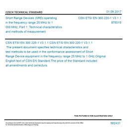CSN ETSI EN 300 220-1 V3.1.1 The present document specifies technical characteristics and test methods to be used in the conformance assessment of Short Range Device equipment in the frequency range 25 MHz to 1 GHz. Original English text of CSN EN Standard. The price of the Standard included all amendments and correcturs.