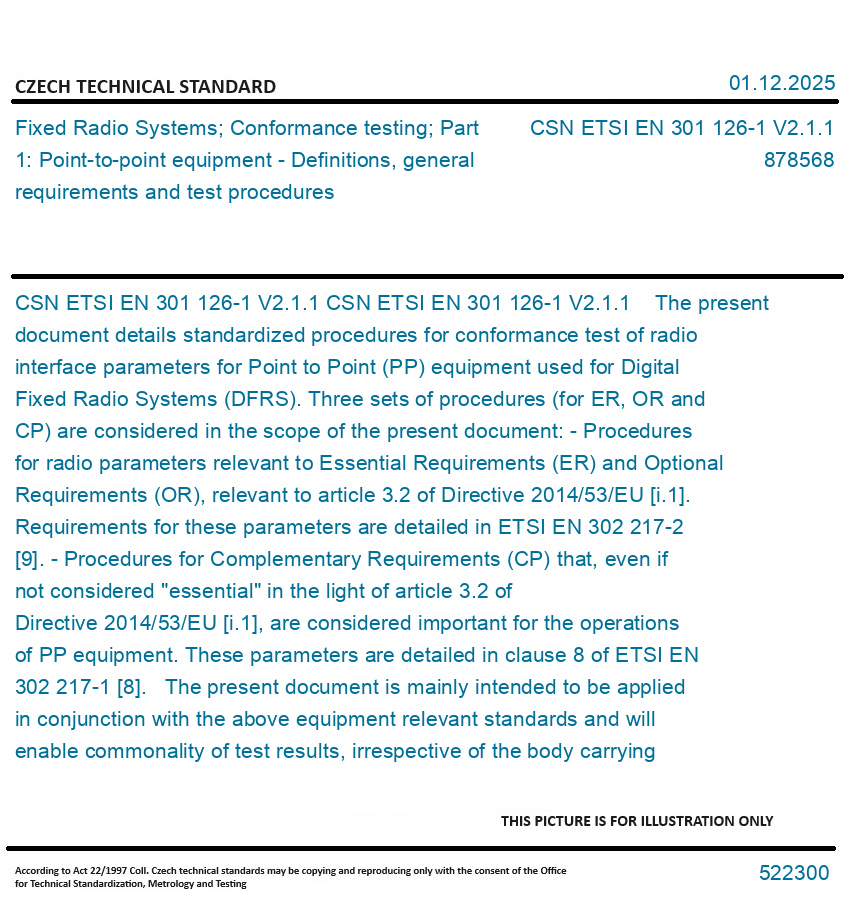 CSN ETSI EN 301 126-1 V2.1.1 The present document details standardized procedures for conformance test of radio interface parameters for Point to Point (PP) equipment used for Digital Fixed Radio Systems (DFRS). Three sets of procedures (for ER, OR and CP) are considered in the scope of the present document: - Procedures for radio parameters relevant to Essential Requirements (ER) and Optional Requirements (OR), relevant to article 3.2 of Directive 2014/53/EU [i.1]. Requirements for these parameters are detailed in ETSI EN 302 217-2 [9]. - Procedures for Complementary Requirements (CP) that, even if not considered "essential" in the light of article 3.2 of Directive 2014/53/EU [i.1], are considered important for the operations of PP equipment. These parameters are detailed in clause 8 of ETSI EN 302 217-1 [8]. The present document is mainly intended to be applied in conjunction with the above equipment relevant standards and will enable commonality of test results, irrespective of the body carrying out the test. However, the present document can be used also in conjunction with other DFRS relevant standards that would refer to the parameters and test methods hereby described. The conformance tests described in the present document are those related to radio specific parameters required directly by the radio equipment relevant standards at antenna ports in conducted test methods. Conformance tests to other boundary standards (e.g. those for system input/output interfaces (i.e. set at X/X' interface, shown in figure 2, and related baseband process) are outside the scope of the present document. Also, tests described in the present document are not applicable to radio equipment with integral antenna of undetachable antenna type requiring radiated test methods. Original English text of CSN EN Standard. The price of the Standard included all amendments and correcturs.