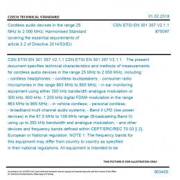 CSN ETSI EN 301 357 V2.1.1 The present document specifies technical characteristics and methods of measurements for cordless audio devices in the range 25 MHz to 2 000 MHz, including: - cordless headphones; - cordless loudspeakers; - consumer radio microphones in the range 863 MHz to 865 MHz; - in ear monitoring equipment using either 300 kHz bandwidth analogue modulation or 300 kHz, 600 kHz, 1 200 kHz digital FDMA modulation in the range 863 MHz to 865 MHz; - in vehicle cordless; - personal cordless; - broadband multi channel audio systems; - Band II LPD (low power devices) in the 87,5 MHz to 108 MHz range (Broadcasting Band II) using up to 200 kHz bandwidth and analogue modulation; - and other devices and frequency bands defined within CEPT/ERC/REC 70 03 [i.2], European or National regulation. NOTE 1: The frequency bands for this equipment may differ from country to country as specified in their national regulations. All equipment is intended to be used with integral antennas. NOTE 2: Cordless audio devices covered within the present document are considered, by definition, Short Range Devices (SRD), the power limits for different frequency bands can be found in the current version of CEPT/ERC/REC 70 03 [i.2], annex 13 (or European or national regulations). NOTE 3: Electromagnetic Compatibility (EMC) requirements are covered by ETSI EN 301 489-9 [i.4]. Original English text of CSN EN Standard. The price of the Standard included all amendments and correcturs.