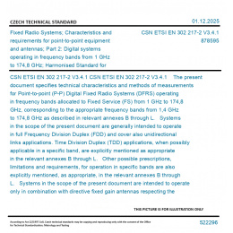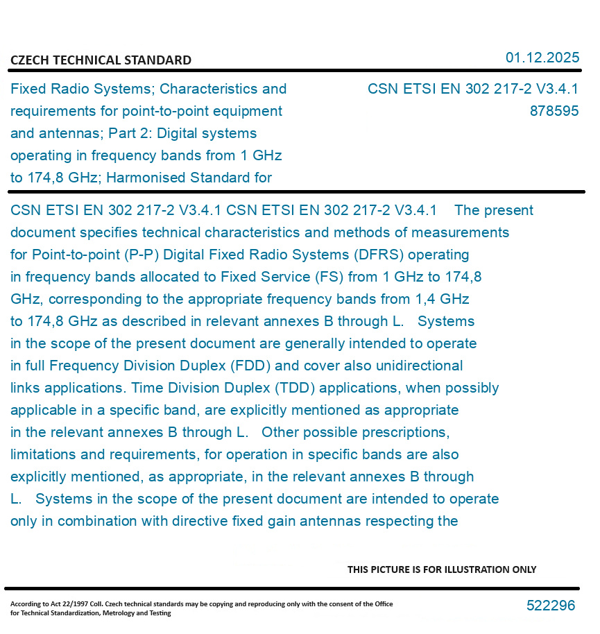 CSN ETSI EN 302 217-2 V3.4.1 The present document specifies technical characteristics and methods of measurements for Point-to-point (P-P) Digital Fixed Radio Systems (DFRS) operating in frequency bands allocated to Fixed Service (FS) from 1 GHz to 174,8 GHz, corresponding to the appropriate frequency bands from 1,4 GHz to 174,8 GHz as described in relevant annexes B through L. Systems in the scope of the present document are generally intended to operate in full Frequency Division Duplex (FDD) and cover also unidirectional links applications. Time Division Duplex (TDD) applications, when possibly applicable in a specific band, are explicitly mentioned as appropriate in the relevant annexes B through L. Other possible prescriptions, limitations and requirements, for operation in specific bands are also explicitly mentioned, as appropriate, in the relevant annexes B through L. Systems in the scope of the present document are intended to operate only in combination with directive fixed gain antennas respecting the technical requirements in ETSI EN 302 217-4 [6]. Systems in the scope of the present document may be composed by equipment without antennas (see informative annex Q for background) or equipment including integral (but physically detachable) or dedicated antenna. Systems including integral antennas physically undetachable from the radio equipment are not in the scope of the present document (see note 1). NOTE 1 - For additional information, the rationale is that the present document as well as ETSI EN 301 126-1 [1] (radio equipment parameters testing) do not provide radiated test methods and ETSI EN 301 126-3-1 [2] (antenna parameters testing) does not provide test methods for undetachable antennas; future revisions could fill this vacancy. NOTE 2 - The relationship between the present document and the essential requirements of article 3.2 of Directive 2014/53/EU [i.1] is given in annex A. Original English text of CSN EN Standard. The price of the Standard included all amendments and correcturs.