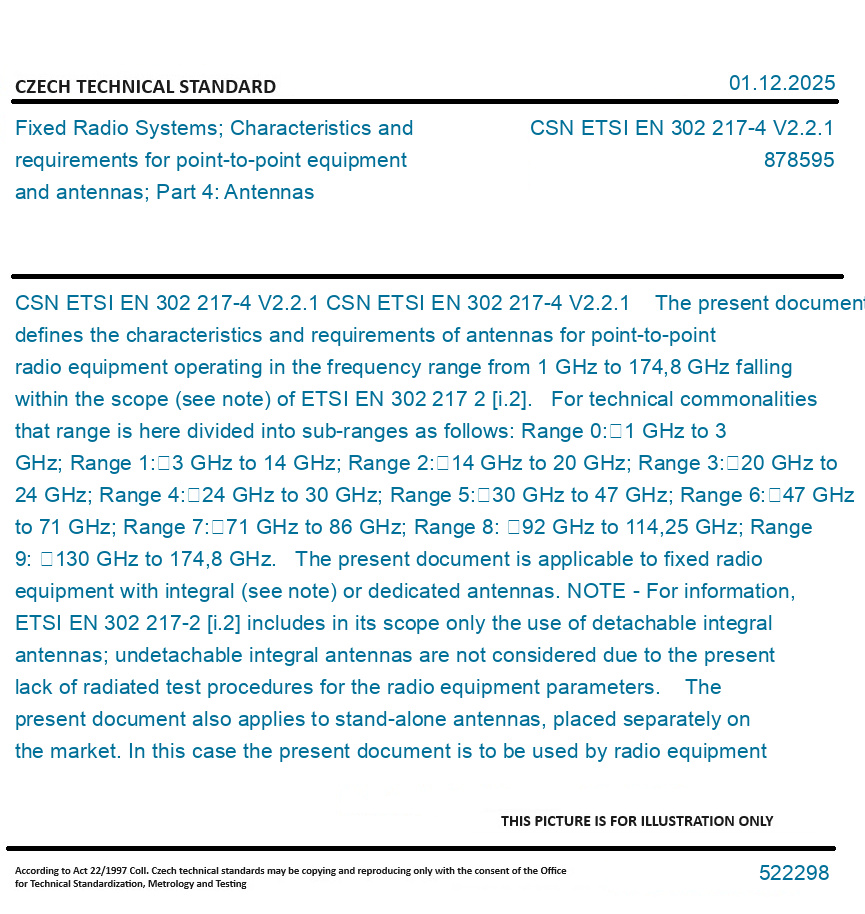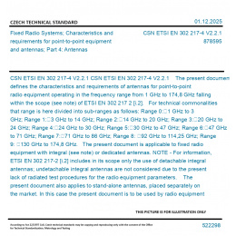 CSN ETSI EN 302 217-4 V2.2.1 The present document defines the characteristics and requirements of antennas for point-to-point radio equipment operating in the frequency range from 1 GHz to 174,8 GHz falling within the scope (see note) of ETSI EN 302 217 2 [i.2]. For technical commonalities that range is here divided into sub-ranges as follows: Range 0: 1 GHz to 3 GHz; Range 1: 3 GHz to 14 GHz; Range 2: 14 GHz to 20 GHz; Range 3: 20 GHz to 24 GHz; Range 4: 24 GHz to 30 GHz; Range 5: 30 GHz to 47 GHz; Range 6: 47 GHz to 71 GHz; Range 7: 71 GHz to 86 GHz; Range 8: 92 GHz to 114,25 GHz; Range 9: 130 GHz to 174,8 GHz. The present document is applicable to fixed radio equipment with integral (see note) or dedicated antennas. NOTE - For information, ETSI EN 302 217-2 [i.2] includes in its scope only the use of detachable integral antennas; undetachable integral antennas are not considered due to the present lack of radiated test procedures for the radio equipment parameters. The present document also applies to stand-alone antennas, placed separately on the market. In this case the present document is to be used by radio equipment manufacturers to provide guidance as to the information for the user, as required by article 10 paragraph 8 of Directive 2014/53/EU [i.1], regarding the antenna characteristics required so as the radio equipment, supplied without antenna, can operate as intended in its technical documentation. The present document is applicable to fixed beam antennas, as well as to "self-alignment tracking" antenna, with limited tracking range, so that all requirements in the present document are respected throughout the tracking angle indicated in the technical documentation. The main body of the present document specifies the characteristics that define the various antenna classes, whilst the annexes provide additional information that is useful to both antenna manufacturers and user/installers. Original English text of CSN EN Standard. The price of the Standard included all amendments and correcturs.